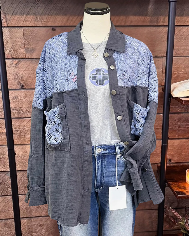 This shirt features gray fabric with blue lace patches on shoulders and pockets. With a button - down design and a collared look, it blends casual and delicate styles, perfect for a trendy layered outfit.